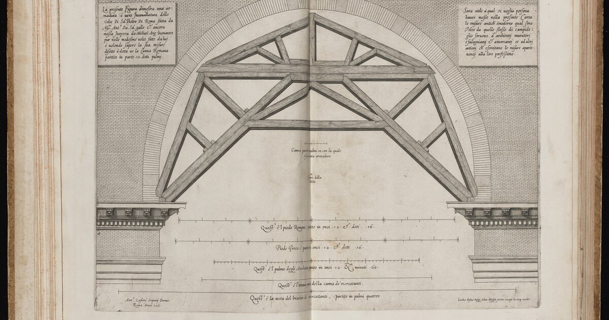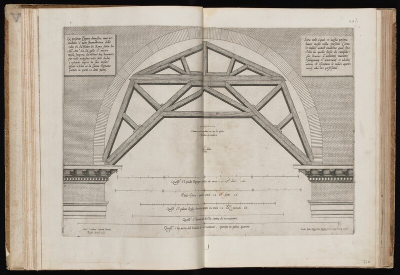 Lettered upper left: "La presente Figura dimostra una armadura o vero Invacallatura delle volte di San Pietro di Roma fatta da M.ro Ant.o da Sangallo et ancora messa in opera da Michael Ang. Buonaroto pur nelle medisime volte fatte da luj. e volendo sapere..."