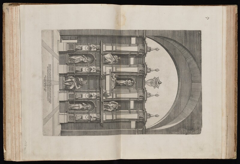 Lettered LC: "Sepulchri Marmorei Iulio II Pont. Max. Divina Mich.Angeli Bonaroti Florentini Manu Romae in Basilica S. Petri ad Vincula Fabrefacti Graphica Deformatio" and "Ant. Salamanca Exc. Romae MD LIIII"