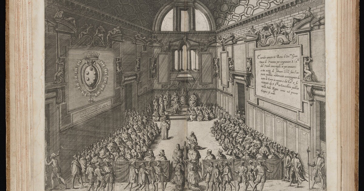 Lettered CR: "Essendo venuto in Roma il Ser.mo Gran Duca di Toscana per ringratiare S. S.ta' del Titolo concessagli et per conoronarsi a Di xviii di Febraro 1570 fece l'intrata publica solennemente accompagnato da tutta la Corte in mezzo a doi Car.li et fu ricevuto da S. S.ta' in Concistorio publico nella Sala Regia come nel presnte disegno si vede"