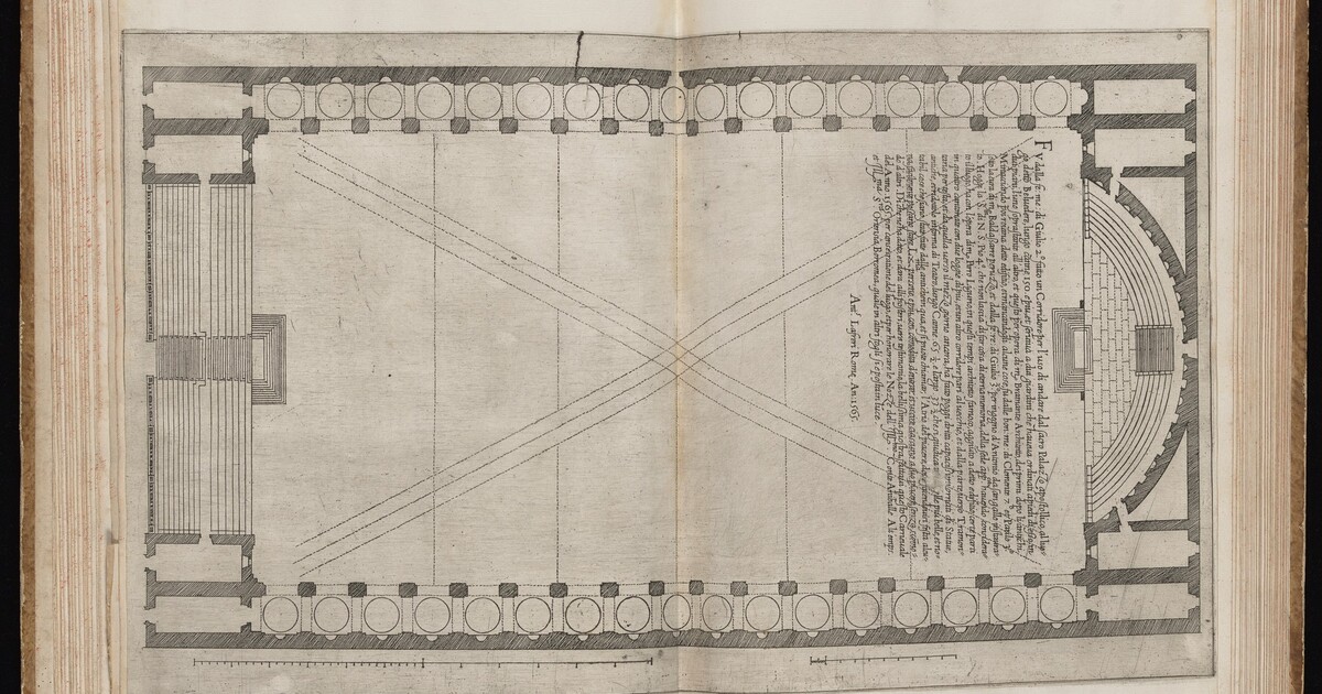 Lettered UC: "Fu dalla fe. me. di Giulio 2o fatto un Corridore per l'uso di andare dal sacro Palazzo apostollico al luogo detto Belvedere [...] e dara alli posteri vero testimonio la bellissima giostra fattavi questo Carnevale del Anno 1565 per comsecratione del luogo et per honorare le Nozze dell'Ill.mo Conte Annibale Altemps et Ill.ma S.ra Ortensia Borromea quale in altri fogli si e posta in luce." and "Ant.s Lafreri Romae An. 1565"