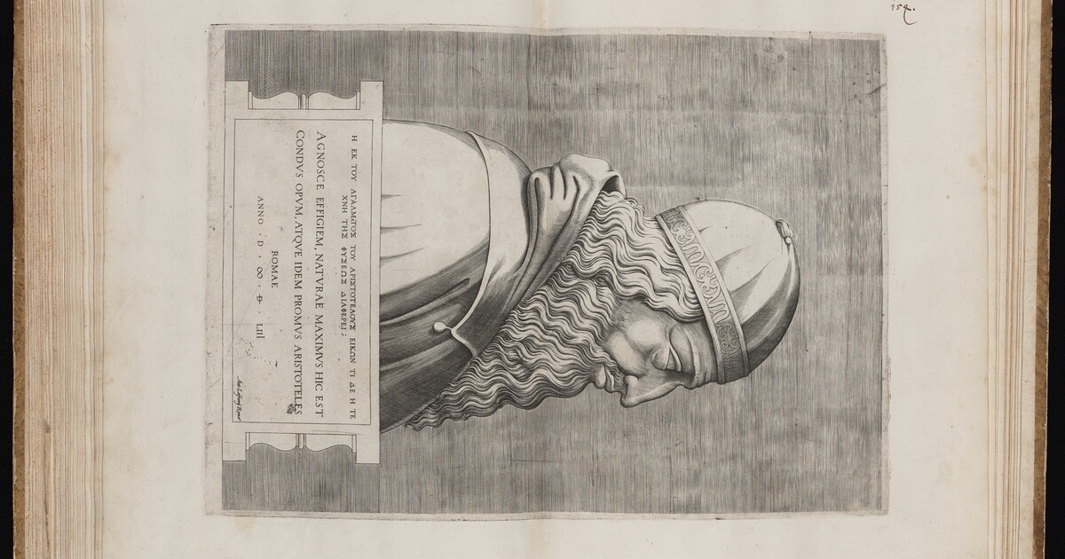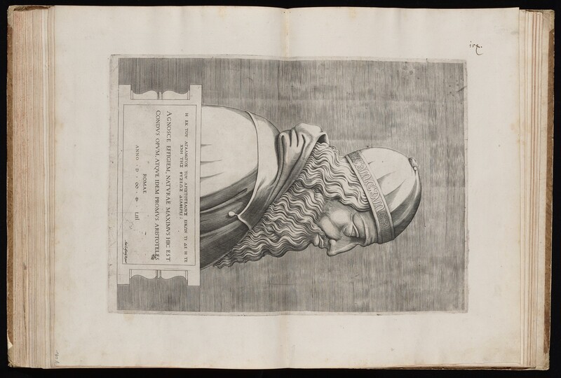 Lettered LC, in Latin: "Agnosce effigiem, naturae maximus hic est condus opum atuqe idem promus Aristoteles. Romae Anno D MDLIII Ant. Lafrerij Romae"