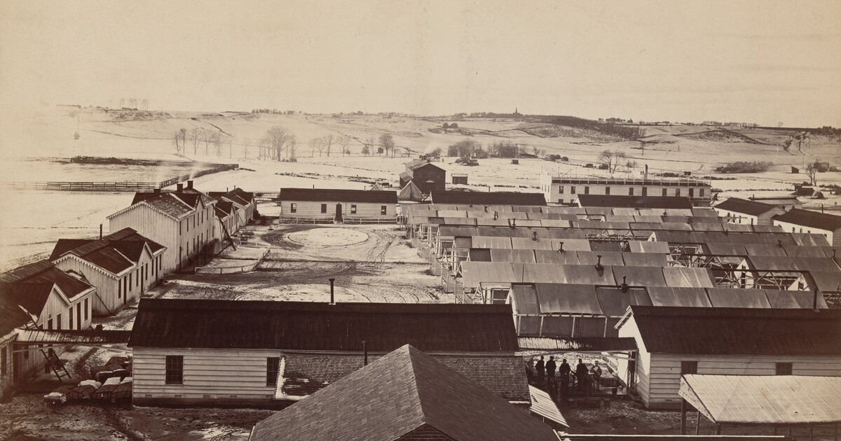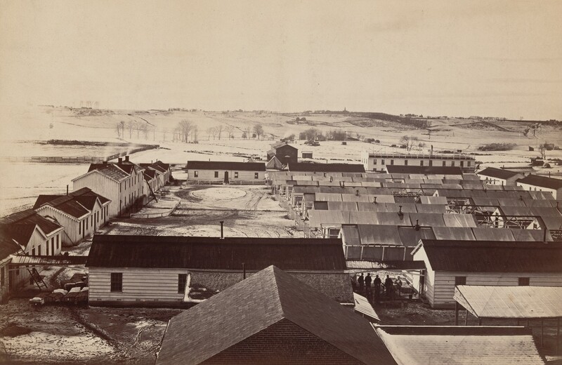 lower center on mount printed in black ink on applied paper: SICKEL HOSPITAL / Looking toward Fairfax Seminary, January 5, 1865.; on verso, by unknown hand, top right in graphite: 123-7; center right in black crayon: 409 [circled] / 12; lower right Culver Service stamp in purple ink