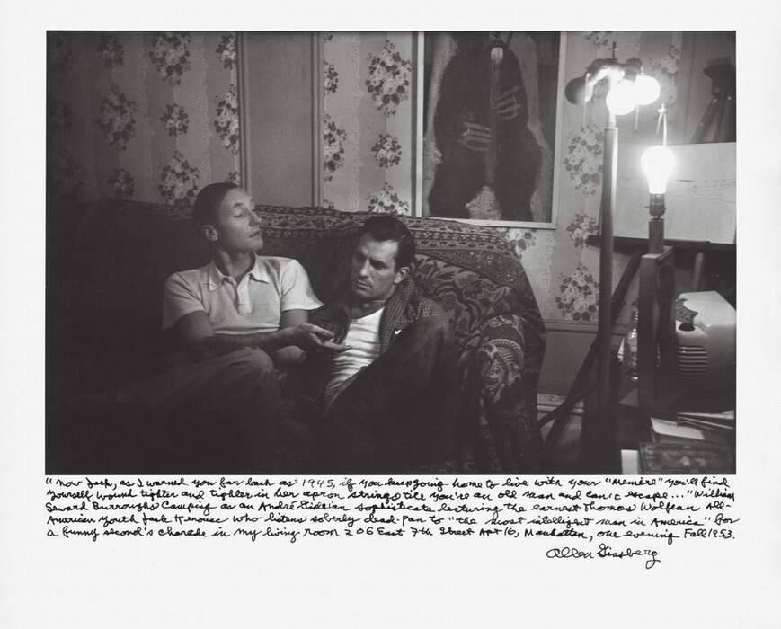 “Now Jack as I warned you far back as 1945, if you keep going home to live with your ‘Memère’ you’ll find yourself wound tighter and tighter in her apron strings till you’re an old man and can’t escape…” William Seward Burroughs camping as an André Gideian sophisticate lecturing the earnest Thomas Wolfean All-American youth Jack Kerouac who listens soberly dead-pan to “the most intelligent man in America” for a funny second’s charade in my living room 206 East 7th Street Apt 16, Manhattan, one evening Fall 1953.