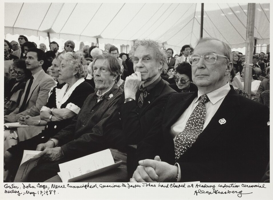 Center, John Cage, Merce Cunningham conscious & Jasper Johns hand clasped at Academy induction ceremonial meeting, May 17, 1989.