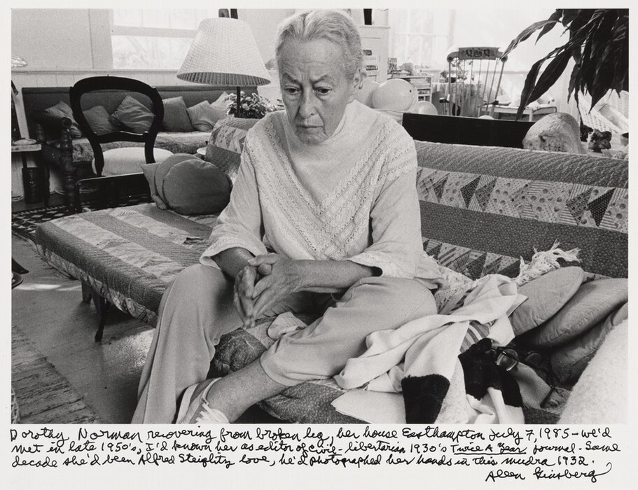 Dorothy Norman recovering from broken leg, her house Easthampton July 7, 1985 - we'd met in late 1950s, I'd known her as editor of Civil-libertarian 1930s Twice a Year journal - same decade she'd been Alfred Stieglitz’s love, he'd photographed her hands in this mudra 1932.