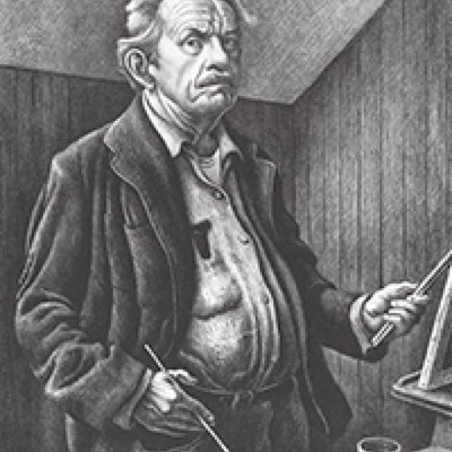 Named after his great-uncle, a five-term senator, Thomas Hart Benton was born on April 15, 1889, in Neosho, Missouri. His father, Maecenus Eason Benton, was a lawyer and a United States representative from 1896 to 1904, so the young Benton spent his early years in both Washington, DC, and southwest Missouri. Benton dropped out of high school at 17 and started working as a cartoonist for the Joplin American newspaper. His mother, Elizabeth Wise Benton, was supportive of his artistic ambitions, but Benton’s father enrolled him in the Western Military Academy in Alton, Illinois, in 1906 before agreeing to allow him to attend the Art Institute of Chicago in 1907. The following year Benton traveled to Paris and studied at the Académie Julian. There he met California artist Stanton Macdonald-Wright and began to experiment with Macdonald-Wright’s synchromist style of abstract painting. In 1911 he returned to the United States and settled in New York. He taught briefly at the Chelsea Neighborhood Association, where he met his future wife, Rita Piacenza, one of his students. During World War I Benton served at the naval base in Norfolk, Virginia, where he made illustrations for a catalog of ships and military equipment. After the war Benton went back to New York, and in 1922 he married Piacenza. The couple was married for 53 years and had two children. They regularly spent summers on Martha’s Vineyard, Massachusetts.