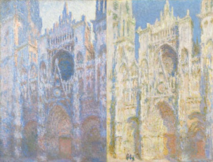 French artist Claude Monet liked to paint the same subject over and over again, at different times of day and in different types of weather. He painted Rouen cathedral in France some thirty times, but what fascinated him most was not the building—it was, he said, the surrounding atmosphere. Rather than quick studies of changing light effects, these pictures, slowly reworked in the studio, are carefully considered explorations of color and mood: