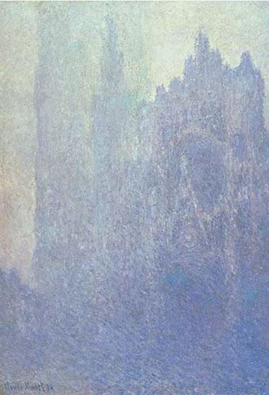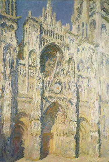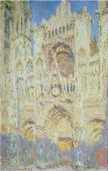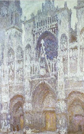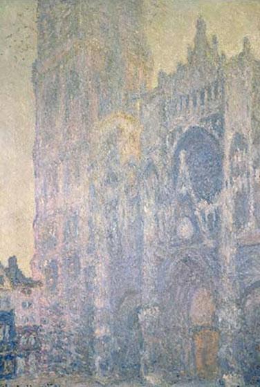 - Each painting uses Rouen Cathedral to record time (morning or late afternoon) and weather (sunlight or mist). Examine the way Monet used color and texture: Can you tell from the shadows in the doorways which painting might have been done in the morning and which in the afternoon? (Don't forget that the sun rises in the east and these paintings show the west façade or front of the building.) How do the colors change in sunlight, fog, and mist?