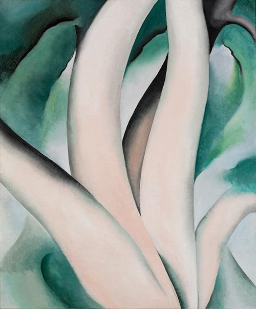 To be sure, a photographic portrait made with a large 8 × 10-inch camera, with its cumbersome set-up, use of umbrellas to reflect the light, and a long exposure time, requires a different kind of collaboration from painting or sculpture. A subtle change of expression, a slight movement in posture, even a shift of the eyes can alter the result. Obviously, O’Keeffe willingly held the poses and the expressions, and especially in the early years of their relationship, as she later stated, she was not only “flattered” by his attention, but deeply in love with him and as supportive of his art as he was of hers. Yet, in later years she distanced herself from the photographs. In 1978, she wrote, “when I look over the photographs Stieglitz took of me, I wonder who the person is.” Noting that “Stieglitz had a very sharp eye for what he wanted to say with the camera,” she continued, “I was asked to move my hands in many different ways—also my head—and I had to turn this way and that. There were nudes that might have been of several different people—sitting—standing—even standing on a radiator against the window.” With her dry wit, she added, “That was difficult—radiators don’t intend you to stand on them!” When asked if she collaborated with Stieglitz, she replied, “You had to collaborate . . . You had to sit there and you had to do what you were told.” And, when asked specifically if the creation of this massive composite portrait, which totaled 331 photographs by the time it was completed in the 1930s, was something she wanted to do, O’Keeffe emphatically replied, “It was something he wanted to do.”
