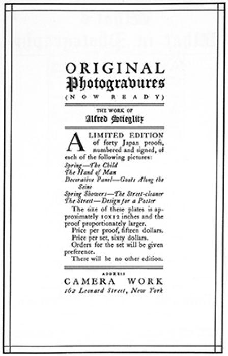 Advertisement for The Work of Alfred Stieglitz, from Camera Work 5 (January 1904), unpaginated, National Gallery of Art, Washington, Alfred Stieglitz Collection