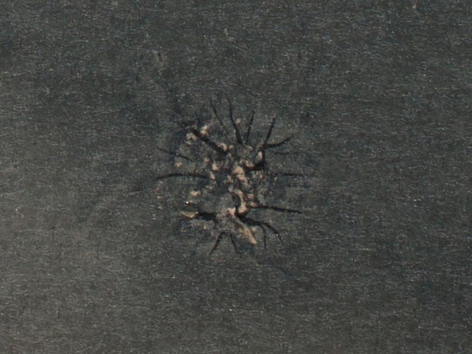 Detail of A Wet Day on the Boulevard, Paris, in normal light (left) and specular light (right). The detail in specular light illustrates the rough texture of the paper.