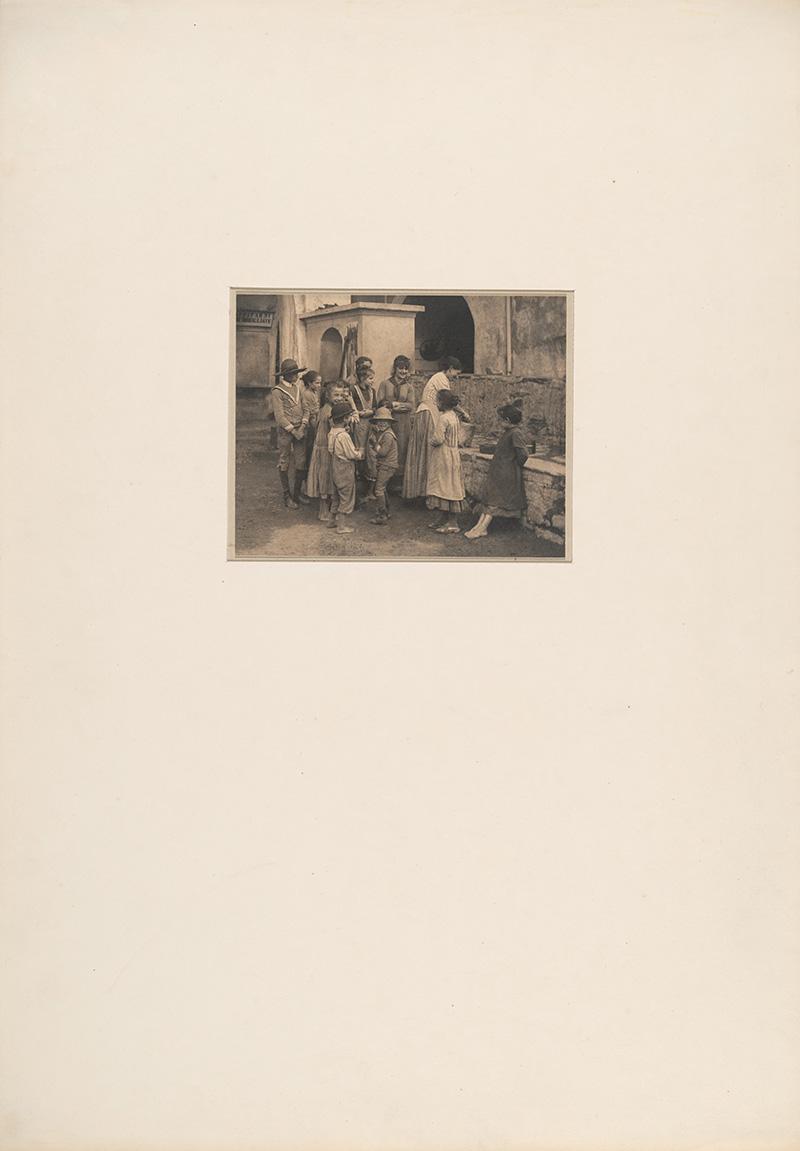 During the 1880s, Stieglitz most often trimmed a print to the edge of the image and placed it on a cream board that was significantly larger than the print itself (often three times its height and width). After attaching the print to the board, he covered it with a cream, single-ply window mat, leaving a space of about 1/4 inch around the print. For vertical prints, he often left twice as much space at the bottom of the board than at the top; for horizontal prints, he usually left two-and-one-half times as much space at the bottom of the board than at the top.