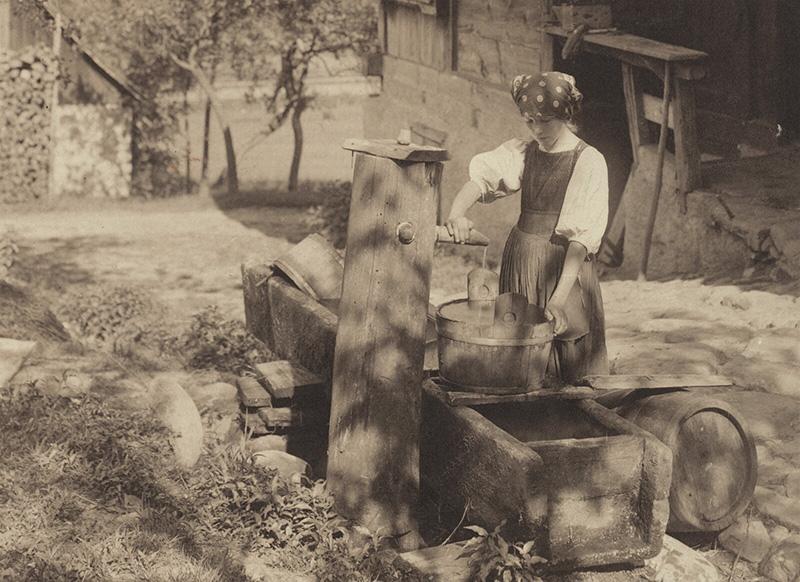 Like carbon prints, the gum bichromate print process is based on the light-sensitive properties of dichromated colloids. The gum process was patented in 1855 but did not gain widespread popularity until the 1890s. The paper is coated with a solution of gelatin or gum arabic, potassium dichromate, and pigment. Once dry, the sensitized paper is exposed to light through a negative to harden the light-sensitive dichromated gum in direct proportion to the amount of light it receives. After exposure, the print is washed with water, leaving behind the hardened, pigmented gum, which forms the positive image. The gum process can be manipulated during processing with brushwork, variations in temperature, or by controlling the force of the water. It is also possible to create “multiple” gum prints by resensitizing already processed gum prints with additional coatings of gum solution in different colors. Platinum prints can also be sensitized with a gum solution and printed again, creating “gum-platinum” photographs.