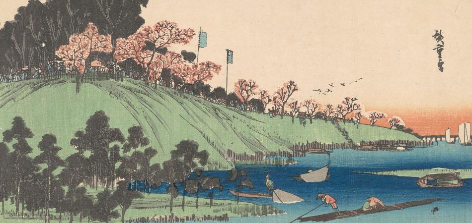 Top image: Andō Hiroshige, Cherry Blossoms in Full Bloom Along the Sumida River [Sumida-gawa hana-zakari], 1839–1842, color woodcut on Japanese paper, download image, not on view, view more prints by Japanese artists