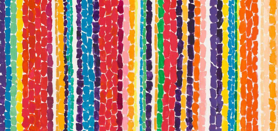 This painting by the 20th-century visionary Alma Thomas is in her signature style of colorful stripes, also known as her “Alma Stripes.” Thomas once said, “The use of color in my paintings is of paramount importance to me. Through color I have sought to concentrate on beauty and happiness, rather than on man’s inhumanity to man.”
