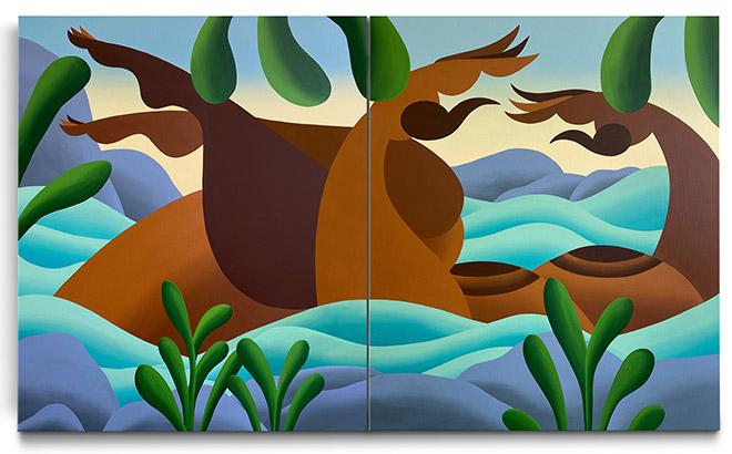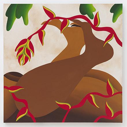 Nemelc creates lively acrylic paintings that bloom with sensuality. In lush landscapes, full-figured women of color lie on bright flower beds or dive into turquoise waters. The images are vibrant, but soothing. They evoke feelings of freedom and tranquility. The beaches, forests, and mountains in her colorful canvases belong as easily in the Caribbean, Indonesia, and South America. Through her signature tropical environments, Nemelc explores spiritual connections between nature, migration, rest, and femininity.