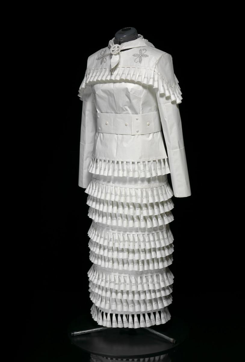 Today many contemporary artists—including Jeffery Gibson (Mississippi Band of Choctaw Indians/Cherokee Nation), Maria Hupfield (Ontario Ojibwe), Marie Watt (Seneca Nation of Indians), and Jason Wesaw (Pokagon Band of Potawatomi)—have taken up the essential materials used to make this dress: the rolled, cone-like jingle fashioned out of a tobacco can lid.