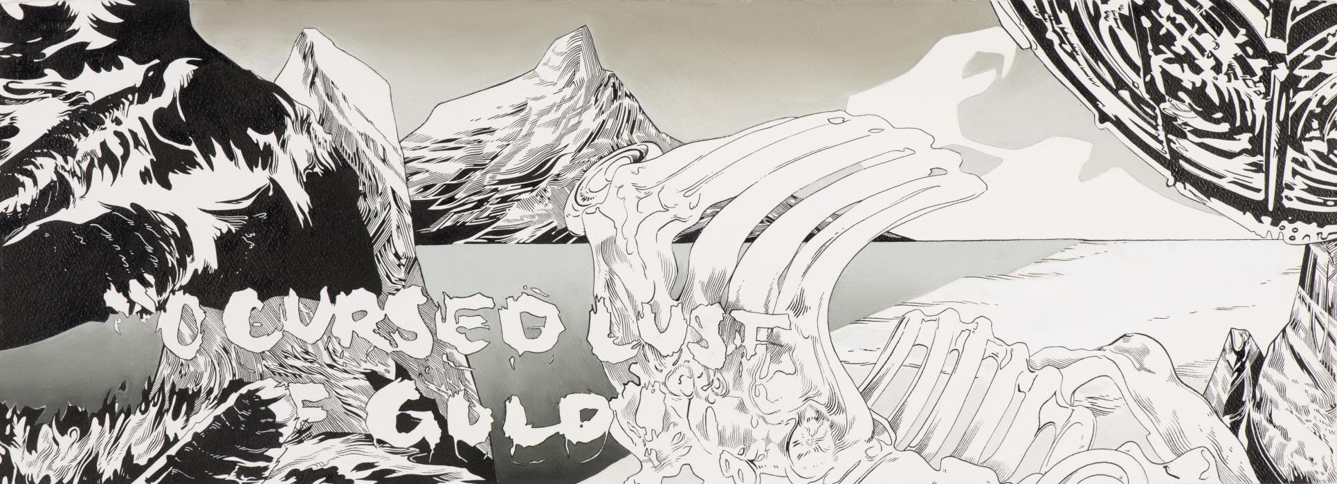 Andrea Carlson, O Cursed Lust of Gold 6, 2014, ink and oil on paper, Collection of Mark and Amy Spencer © Copyright of the artist. Photo courtesy of Bockley Gallery