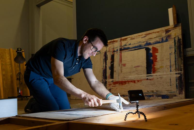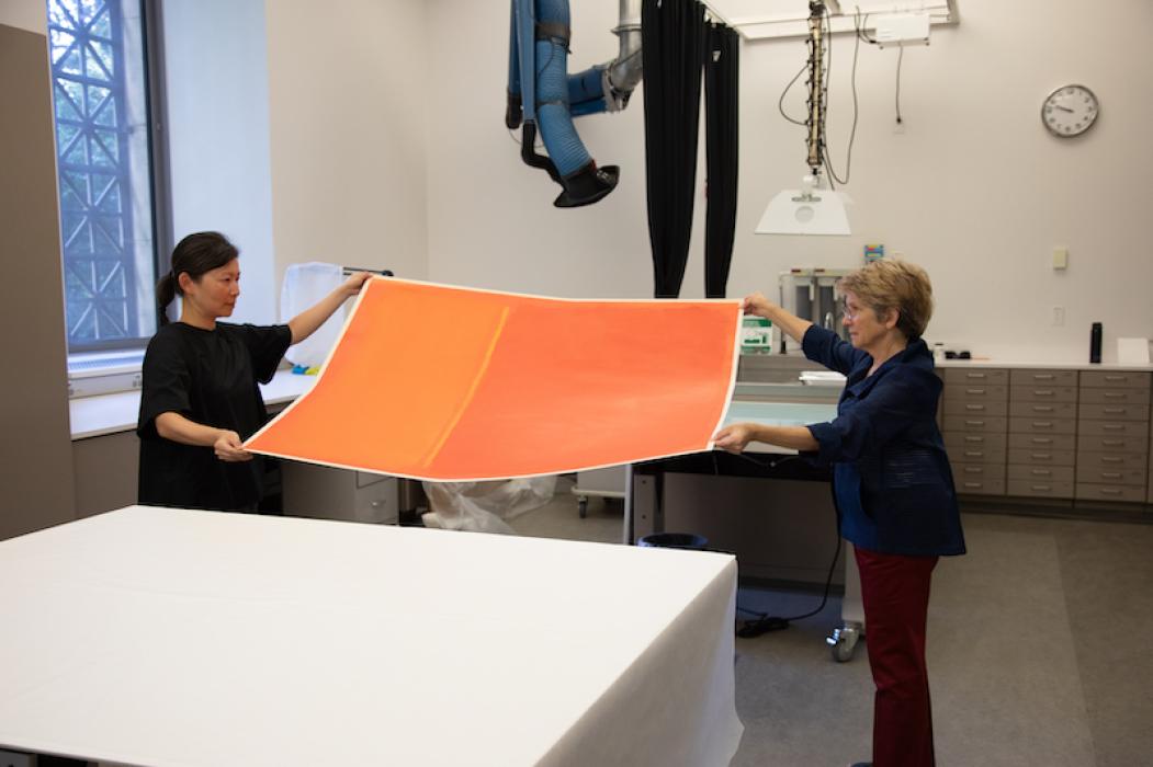 Conservators Minah Song and Kim Schenck preparing to mount one of Rothko’s paintings onto an aluminum panel. Photo by Munyang Tengen, Howard University undergraduate intern.