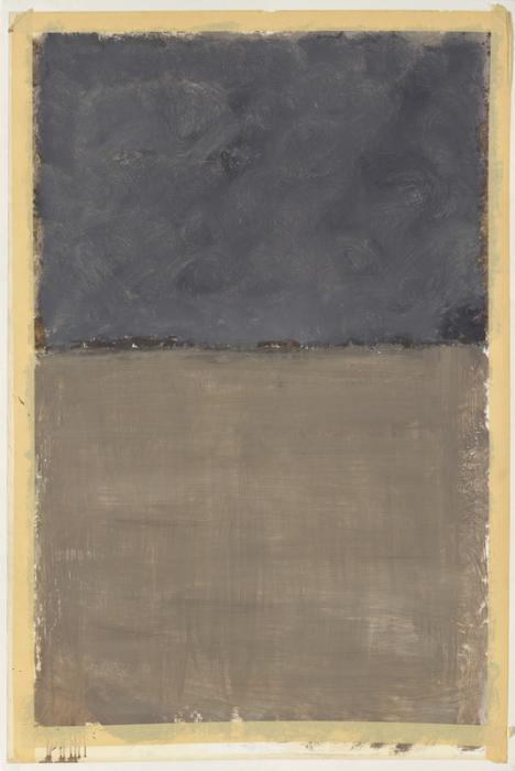 After finishing the fields, Rothko covered their outer edges with masking tape, which he never removed. Through this simple experiment, he tested the effect of a hard-edged border. Rothko then used a similarly hard-edged border of exposed white paper for the rest of the Brown and Gray series, which marked an important development in his late work.