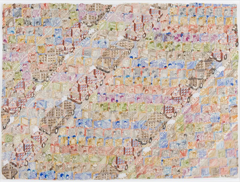 Working in a small town not far from the intersection in New Road, self-taught artist Timothy Wehrle examines the region with vivid, kaleidoscopic vision. His 2009 work Inner Kingdom Thieving Speedway uses watercolor, graphite, and colored pencil to suggest mobility and claustrophobia. Both come with living in a small town where the economic and cultural decline is tied to the nonstop currents of nearby Interstate 80. The work is an elaborate critique of Iowa’s monoculture (the cultivation and growth of a single crop)—both agricultural and social. Wehrle casts local history through the prism of dreams, metaphors, and allusions. The power in his hypnotic, mirroring work comes from the meeting of interior and exterior worlds.
