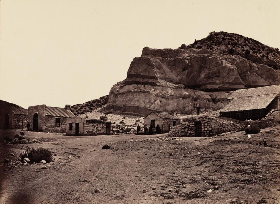 The vantage point is the site from which the first photo was taken, and finding it takes patience. First, the photographer lines up things in background of the original photograph with the scene in front of them. Using two points in the view, they “back triangulate” where to put the camera. Except the ground is always moving. There has been erosion or an earthquake. Or humans have built a road or a building where the original photographer stood. Or the view has changed. Out of the five structures in O’Sullivan’s image, only one house was still standing.