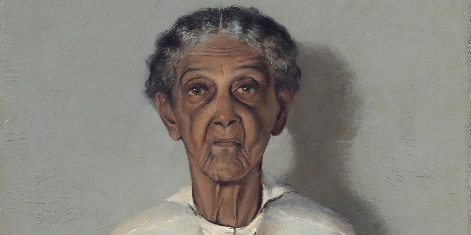 Emily Sims Motley, 80 years old at the time of this portrait, had lived an incomprehensibly hard life. She was born enslaved and lived through the Civil War on a sugar plantation in Louisiana. Emily later moved north with her family, settling in Chicago. By 1922, she lived on the South Side of Chicago, together with four generations of her family, including the artist. She and her grandson shared the top floor: his art studio and her bedroom were adjacent.