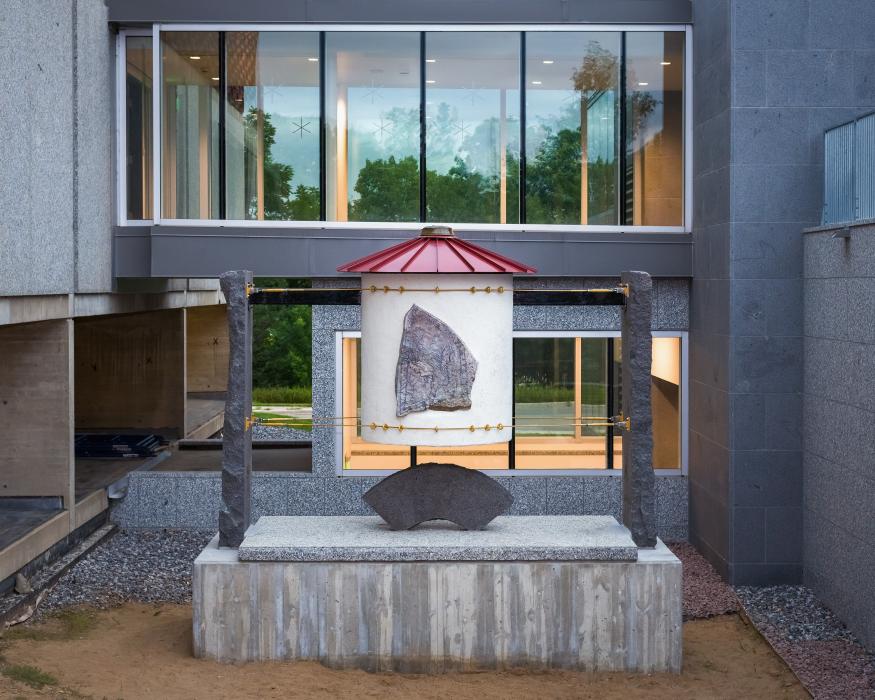 At the center of the work is a cylindrical kura suspended in the air. Inside, there is a stainless steel chamber. The chamber holds a ceramic jar, which in turn holds a scroll letterpressed by local artist Mary Bruno. It bears the text of The Rule of Saint Benedict, the book that has guided Benedictine monks for centuries.