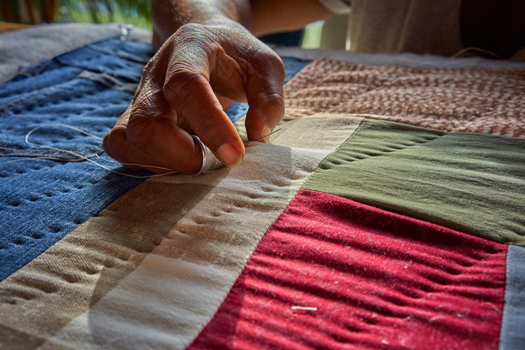 Mary Margaret Pettway stitches a quilt. Photo © Stephen Pitkin/Pitkin Studio