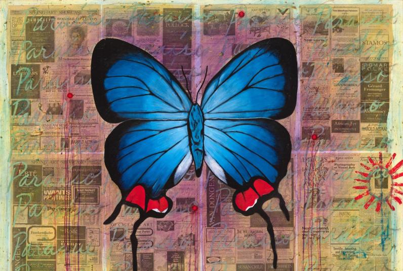 Dominican American artist Freddy Rodríguez’s Paradise for a Tourist Brochure is part of a series critiquing Dominican dictator Rafael Trujillo. Red bullet holes and handprints refer to the dictatorship’s violence and abuse. In contrast, the word paraíso (paradise) repeats across the canvas. At the center is a blue butterfly. For Rodríguez, butterflies symbolized silent witnesses to the atrocities of life in the Americas since colonization.