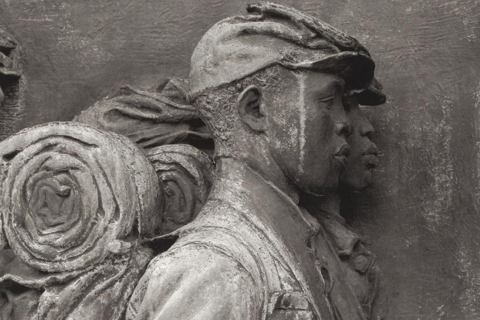 Weems first used an image of The Shaw 54th Regiment Memorial in her highly acclaimed series From Here I Saw What Happened and I Cried, 1995–1996, consisting of approximately 30 reproductions of 19th- and 20th-century photographs. Some of the pictures address photography’s problematic role in perpetuating racist ideas, while others call attention to the unknown African American subjects of now-celebrated pictures, whose images were almost always used without their permission. One of the pictures in the series is a photograph by Richard Benson of some of the soldiers depicted in The Shaw 54th Regiment Memorial. Weems cropped and reprinted Benson’s picture in red and covered it with a sheet of glass etched with the words “Restless through the longest winter you marched and marched and marched.” By focusing on the soldiers, Weems diminishes the heroism of Colonel Shaw, who towers above them in the sculpture, and instead celebrates the African Americans.