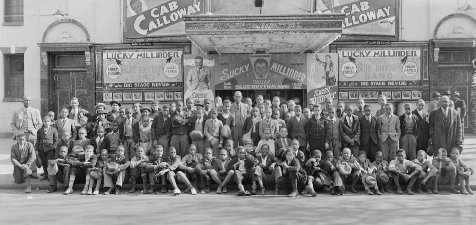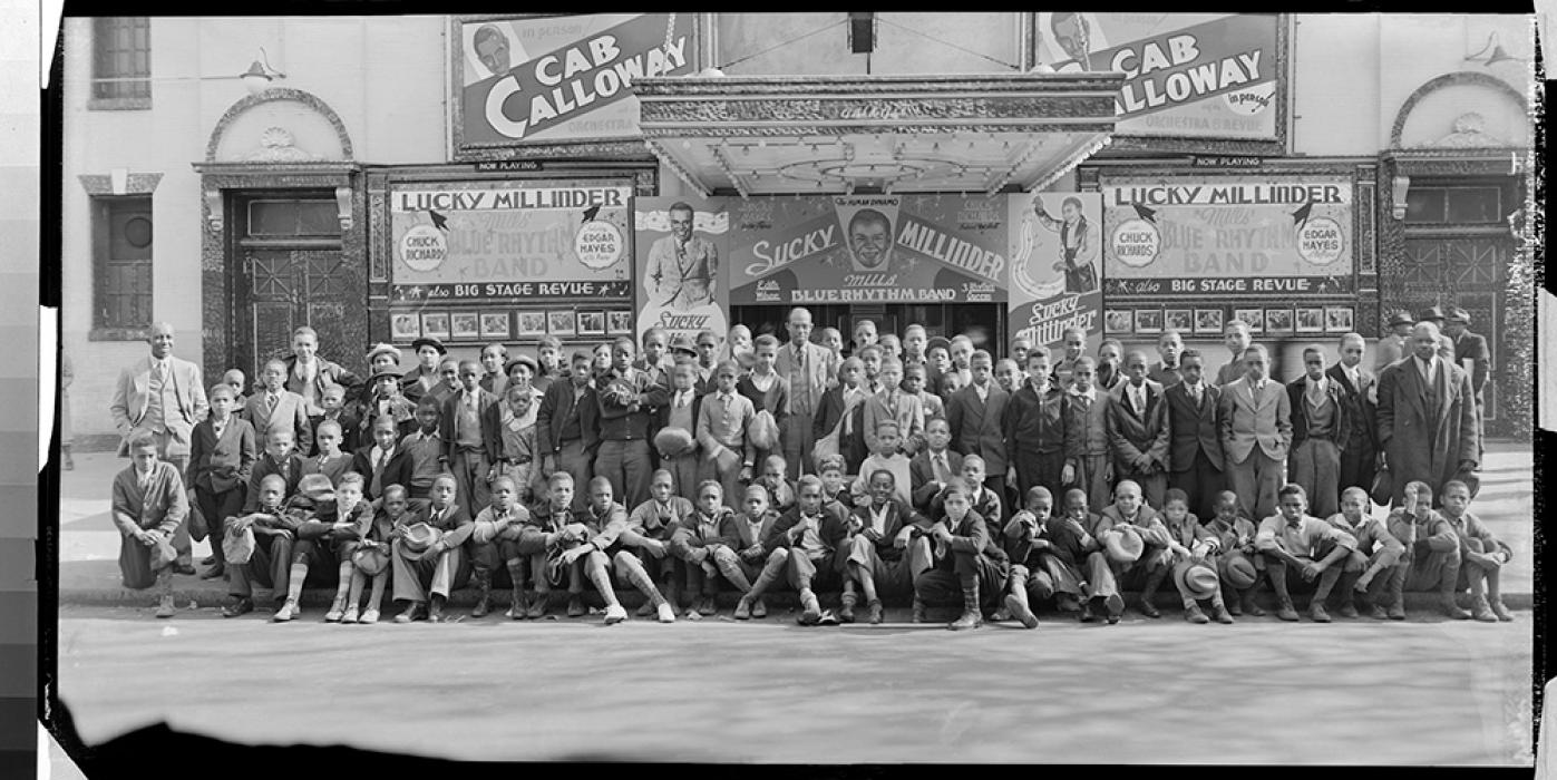 Addison N. Scurlock, Shep Allen (center) with newsboys at Howard Theatre, 1936, negative, Scurlock Studio Records, Archives Center, National Museum of American History, Smithsonian Institution