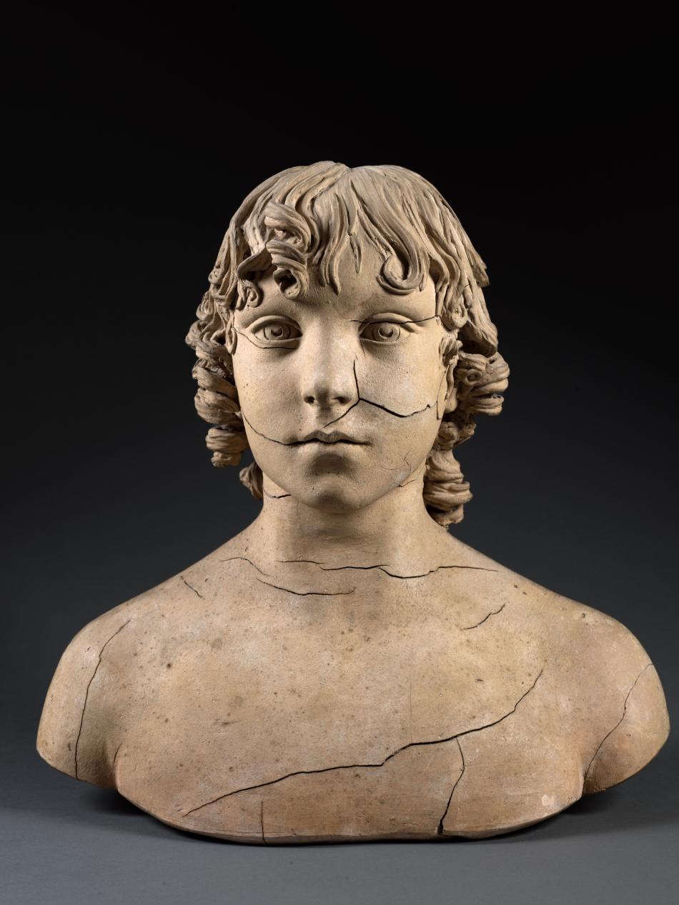 Many of Canova’s clay studies were also highly finished. His sensitive portrayal of a boy is a rare and wonderful example. Still, the first thing we notice is the network of cracks running all over it.
