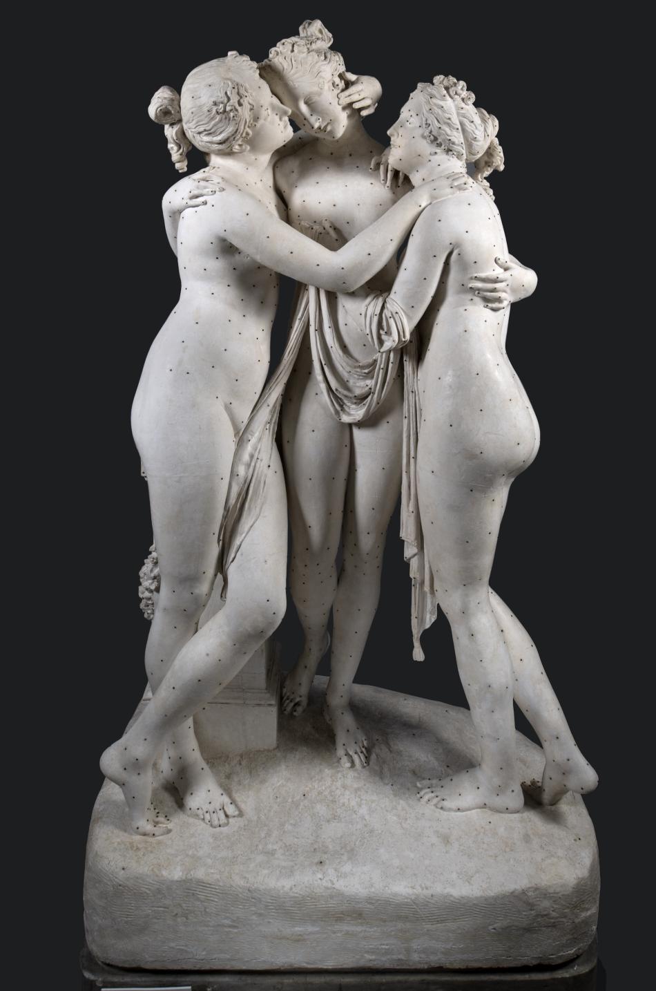 To transfer a design to marble, Canova relied on studio assistants, measuring tools, and a mechanical system called pointing. Black dots on the plaster model served as fixed points that Canova and his assistants transferred, through careful and precise measuring, to the same positions on a rough marble block. Many sculptors still use this method today.