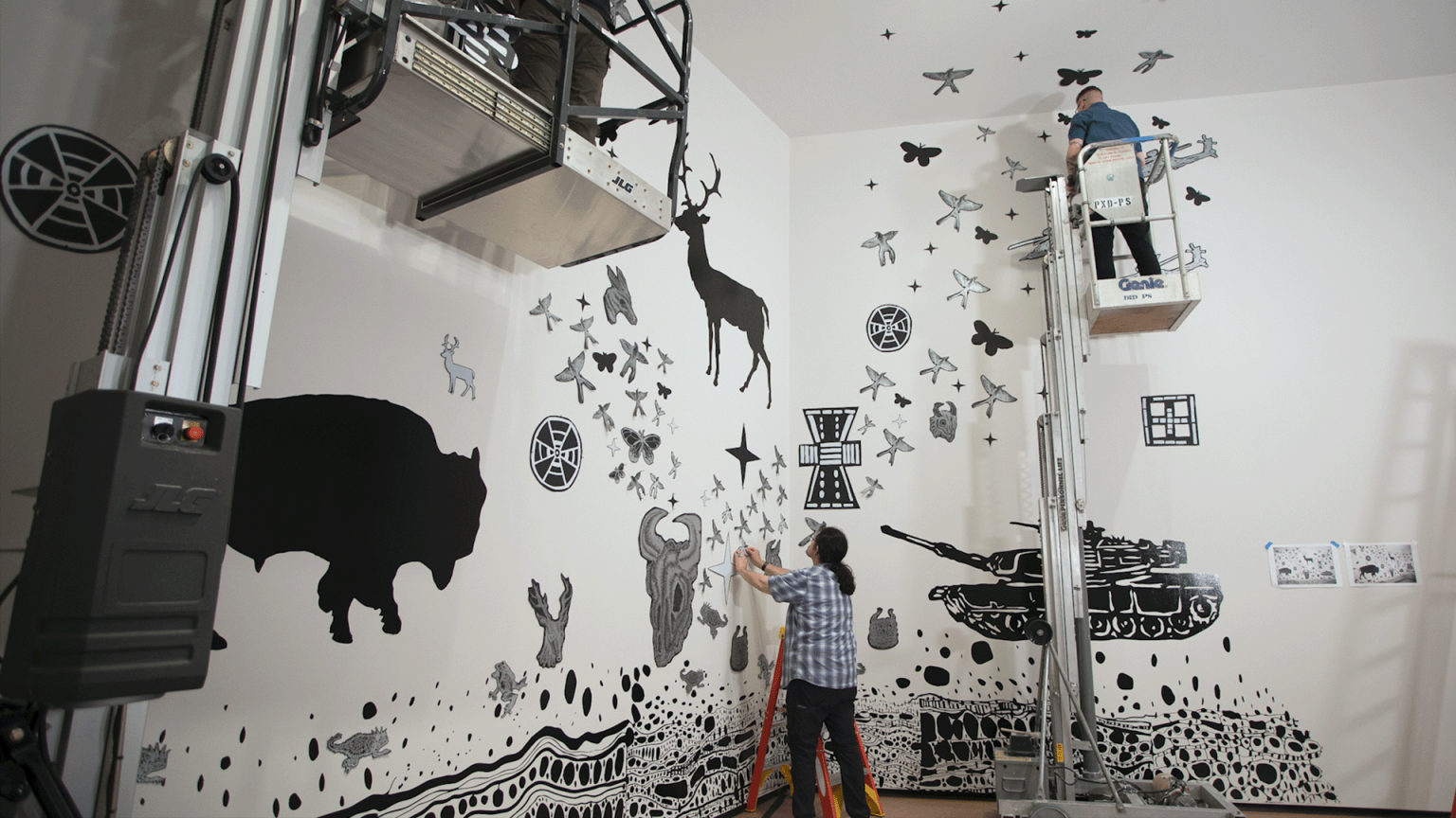 John Hitchcock's (Comanche/Kiowa/European descent) work Impact vs. Influence uses symbols like animal heads, tanks, helicopters, birds, butterflies, and an hourglass to speak to the complexity of our shared environment and the “hopeful small moments” inside that chaos.