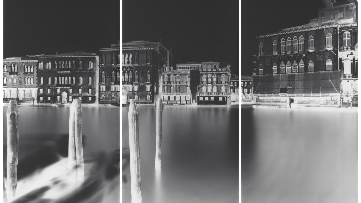 Drawing on one of the earliest forms of photographic technology, Vera Lutter (German, b. 1960) creates monumental photographs of compelling architectural spaces. She first builds a camera obscura by darkening the interior of closed spaces—a suitcase, shipping container, or apartment—and leaving a small pinhole opening for light to enter. Placing light-sensitive paper opposite the opening, Lutter then exposes an image of the exterior view on the paper for an extended period of hours, days, even months. The unusually long exposure time challenges notions of photography’s instantaneity, producing images that capture the passage of time rather than a singular moment. For Ca' del Duca Sforza, Venice II: January 13–14, 2008, Lutter transformed a room in the Palazzo Sforza into a camera to create a stunning and uncanny view of the Grand Canal in Venice.